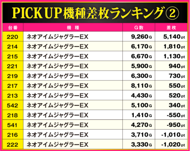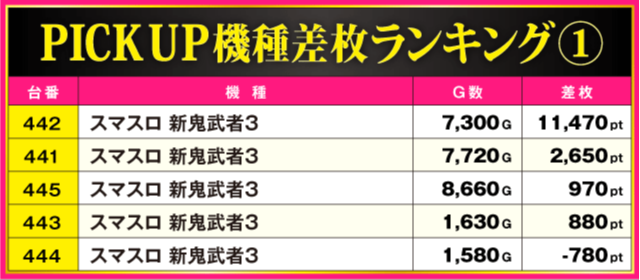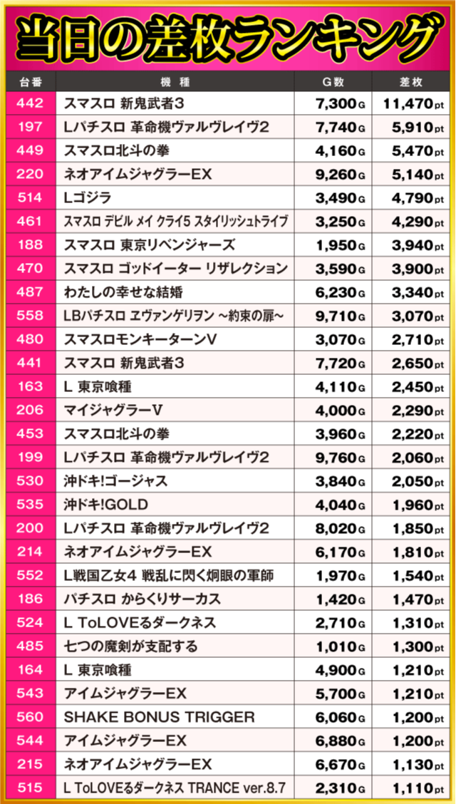 この日、最もプレイヤーの注目を集めたのが『スマスロ 新鬼武者3』で、442番台が万枚超の+11,470ptを叩き出しランキングトップに。次いで、導入直後の新台『Lパチスロ 革命機ヴァルヴレイヴ2』をはじめ『スマスロ北斗の拳』、『ネオアイムジャグラーEX』が+5,000pt超を記録するなど、新旧を問わず様々な機種からハイスコアが飛び出している。