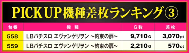 今回のPICK UP機種は全3機種で、差枚上位にランクインした『スマスロ 新鬼武者3』と『ネオアイムジャグラーEX』以外にも『LBパチスロ ヱヴァンゲリヲン ~約束の扉~』から+3,070ptが発生。さらに、最終的にプラス差枚となった台が多数確認されており、それぞれのシマは常にファンの笑顔と活気に満ち溢れていた。