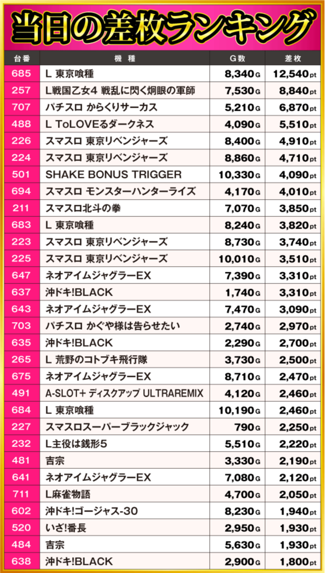 当日の差枚ランキング