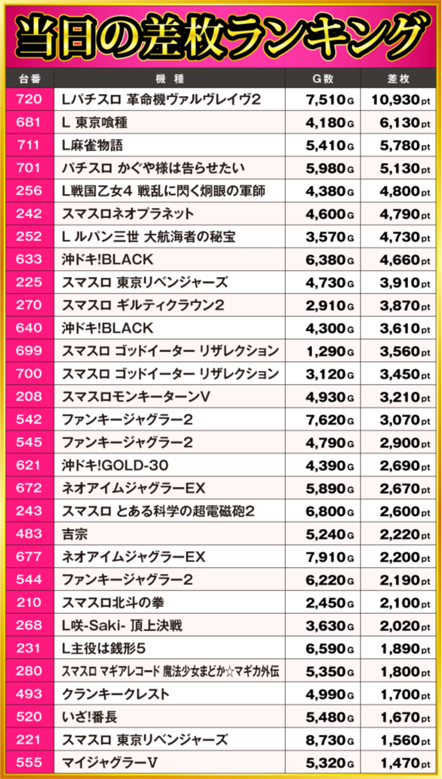 この日、差枚ランキングのトップに輝いたのは、導入間もない『Lパチスロ 革命機ヴァルヴレイヴ2』で、720番台が万枚超の+10,930ptを記録。次いで、『L 東京喰種』から+6,130pt、『L麻雀物語』と『パチスロ かぐや様は告らせたい』から+5,000pt超が飛び出し店内を盛り上げていた。