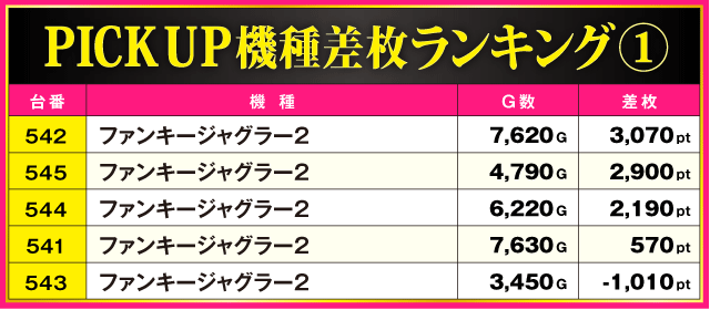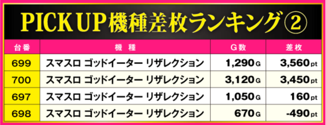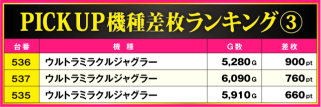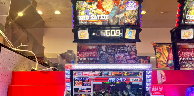 次にPICK UP機種の状況をチェック!! 『ファンキージャグラー2』は全5台中4台、『ウルトラミラクルジャグラー』3台全てがプラス差枚となる、ジャグラーシリーズならではの安定感を披露している。また、『スマスロ ゴッドイーター リザレクション』からは+3,000pt超が2台も飛び出しており、3機種のシマは常に活気に満ち溢れる一日となった。