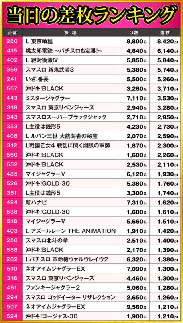 当日の差枚ランキング