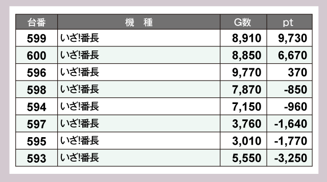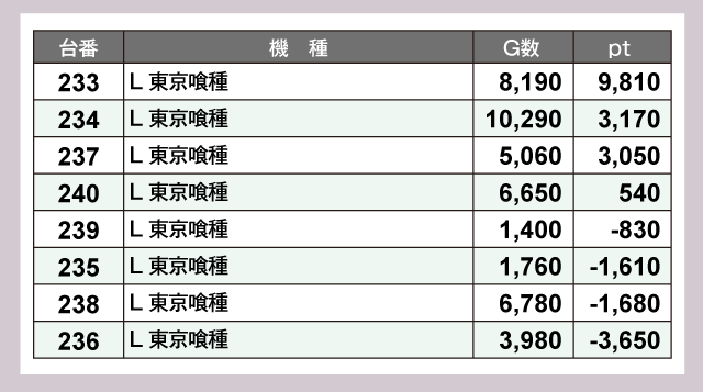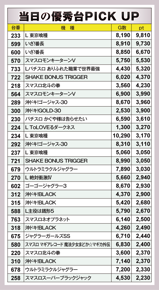『L 東京喰種』233番台が+9,810ptの好成績で、圧倒的な輝きを放っていた。そして『いざ!番長』599番台が+9,730pt、600番台が+6,670ptでつづく。さらに『スマスロモンキーターンV』570番台の+5,530pt、『Lパチスロ ありふれた職業で世界最強』733番台の+5,320ptなど、誰もがうらやむような優秀台が多数誕生していた。