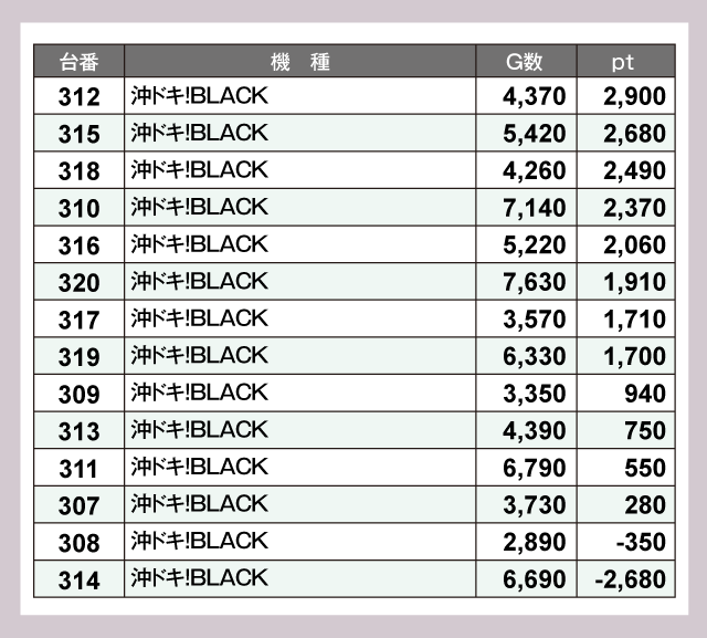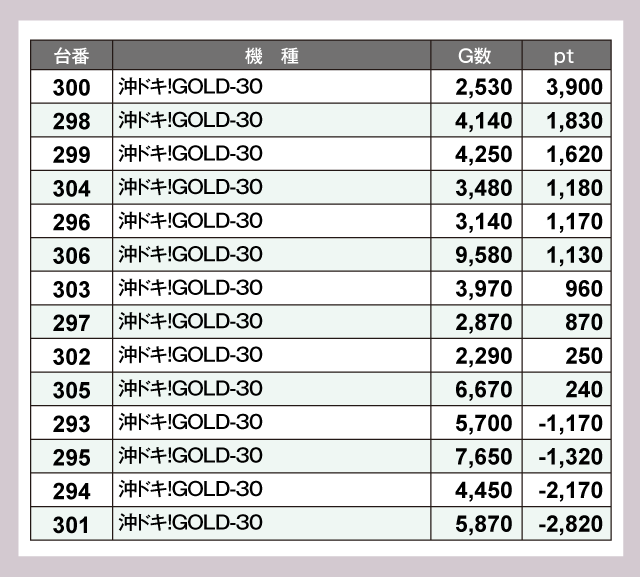 地域最大級の『沖ドキ』シリーズからは、それぞれ14台設置の『沖ドキ!BLACK』と『沖ドキ!GOLD-30』に注目。4桁プラスptの台が多く生まれ、非常に活況となっていた。