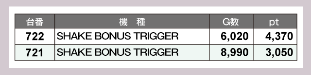 『L 東京喰種』からは1万G超えや1万ptオーバーなど、ポテンシャルを発揮した台を確認している。『SHAKE BONUS TRIGGER』は2台とも高稼働、かつ好成績となっていた。