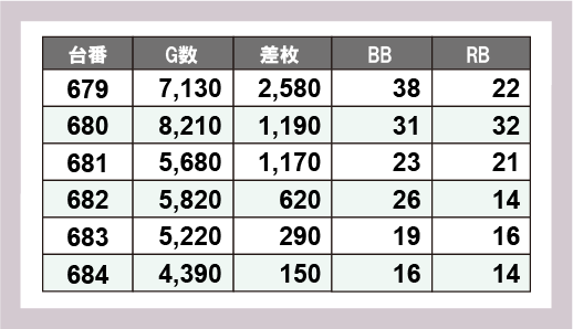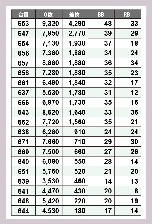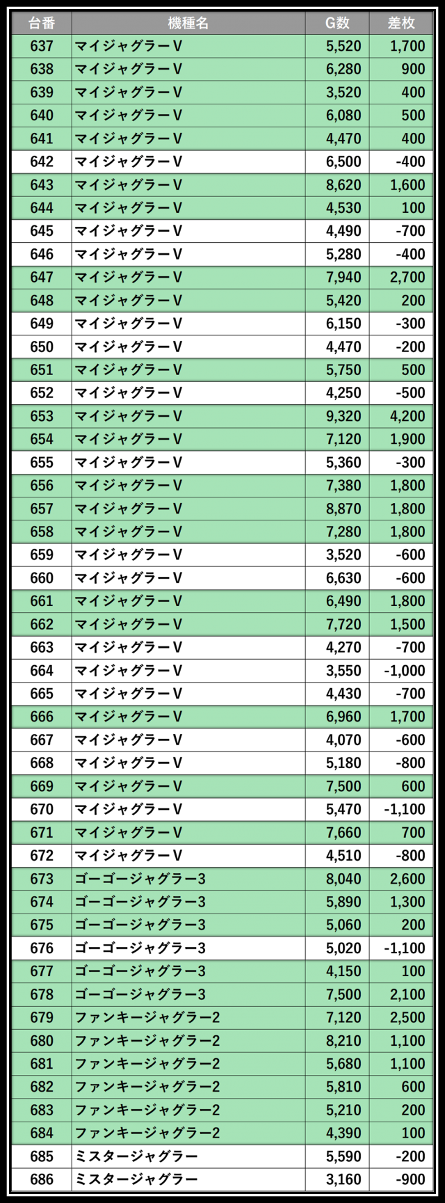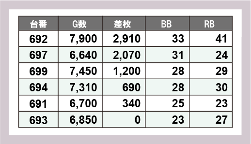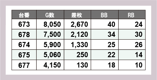 ノーマルタイプの主役『マイジャグラーⅤ』では、4,000枚OVERの好結果を筆頭に複数の台がしっかりとプラス差枚を記録。さらに『ファンキージャグラー2』『アイムジャグラーEX』『ゴーゴージャグラー3』など各機種でも4桁プラスが連発し、ノーマルタイプらしい堅実かつ華やかな盛り上がりを演出した。