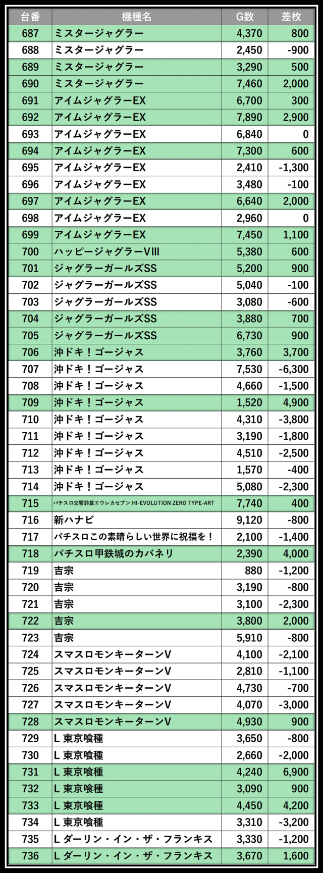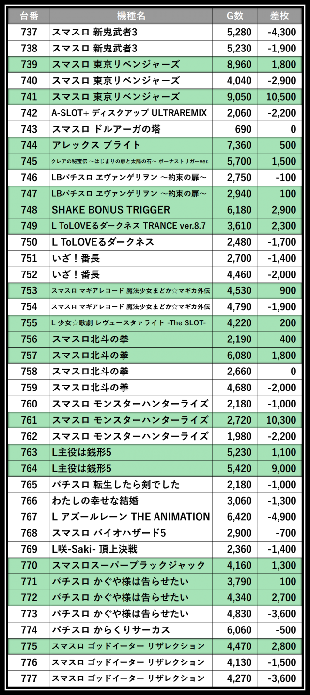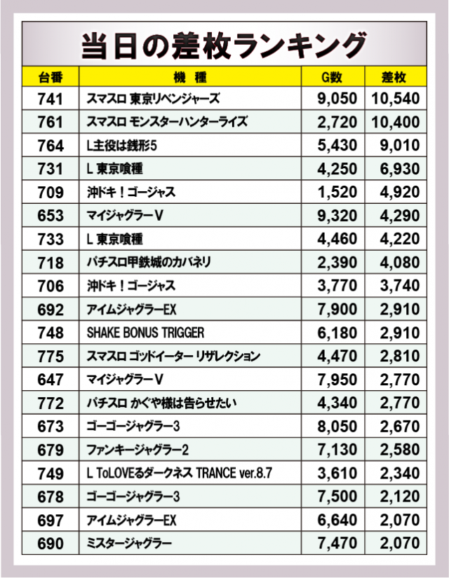 全体ランキングでは『スマスロ 東京リベンジャーズ』が+10,540枚を記録し、堂々のトップに輝いた。続く『スマスロ モンスターハンターライズ』でも+10,400枚をマークし、スマスロ勢の勢いが止まらない展開に。さらに『L主役は銭形5』も9,000枚OVERと好成績を残し、上位陣はハイスペック機が独占。加えて『ジャグラー』シリーズからも2,000枚超の好結果が複数誕生し、終日にわたって活気ある光景が広がっていた。