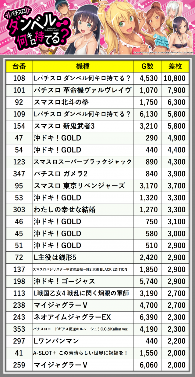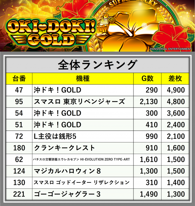 厳選された取材対象機種をはじめ、その他スロット全体から好記録が飛び出した!プレイヤーが楽しんだ1日を下記データにて振り返ってみて欲しい。