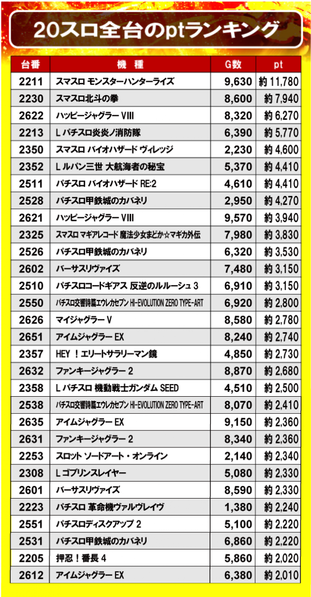 トップを飾った『スマスロ モンスターハンターライズ』約11,780ptを記録し、見事万ptOVERを達成!続けて『スマスロ北斗の拳』も約7,940ptという十分な結果を出し、健闘ぶりを見せた。また『ジャグラー』シリーズも存在感を強くアピールしており、各所で熱い展開が繰り広げられていた!