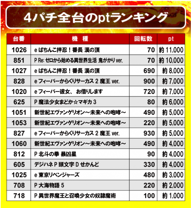 『eぱちんこ押忍!番長 漢の頂』から約11,000pt!そして、TOP2が『P Re:ゼロから始める異世界生活 鬼がかりver.』から、約10,000pt!この2台がリードする形で店内を熱く盛り上げた。