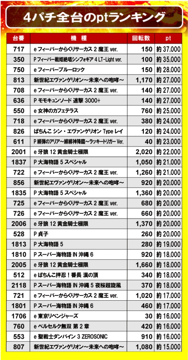 今回トップを飾った『eフィーバーからくりサーカス2 魔王ver.』が見事に約37,000ptを獲得。その後を追う形で『Pフィーバー戦姫絶唱シンフォギア4 LT-Light ver.』も約35,000ptという立派な数字を叩き出し、どちらの機種もファンを熱くさせる素晴らしいを盛り上がりを見せた!