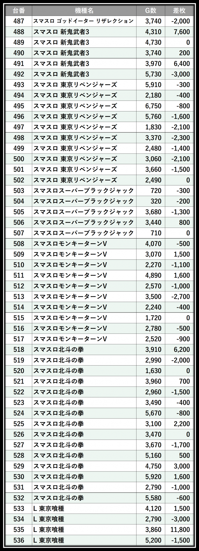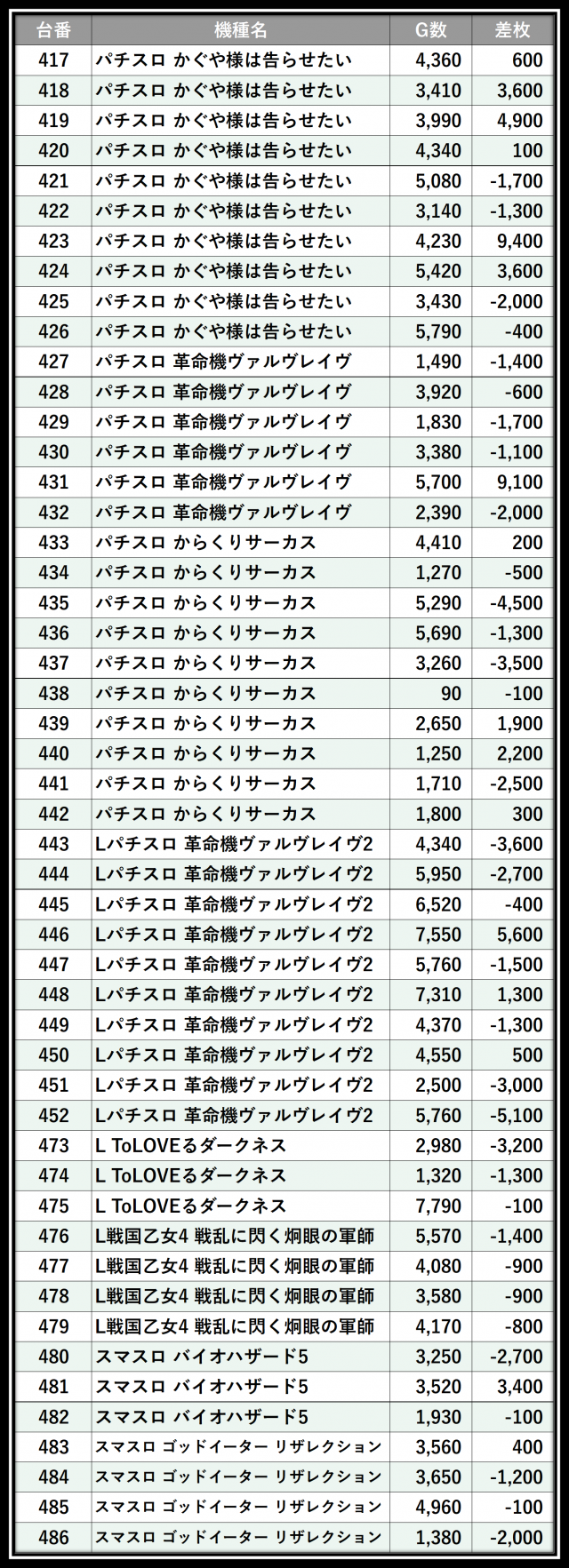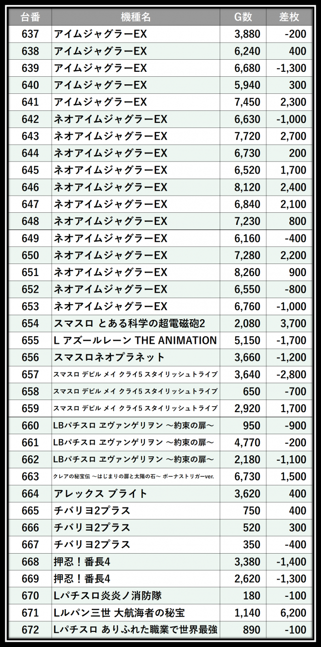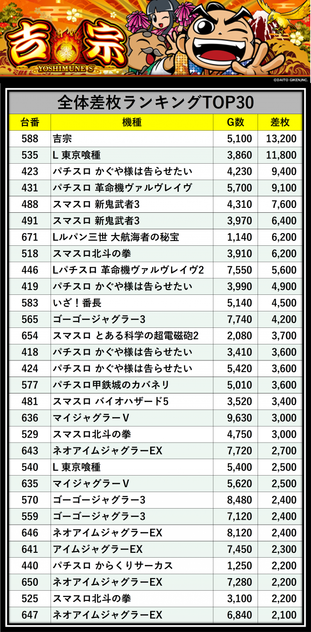 ※差枚数順に掲載しています