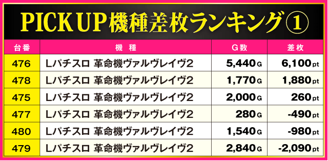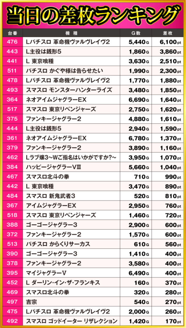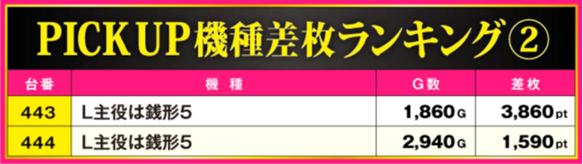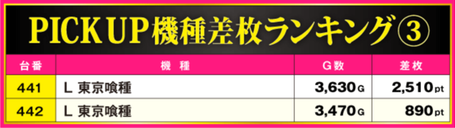 今回のPICK UP機種は差枚上位にランクインした3機種。ハイスコアが飛び出しただけでなく、3機種トータルの全10台中7台がプラス差枚で実戦を終える見事な結果を残しているだけに、ファンにとって充実の一日となったのは間違いないだろう。