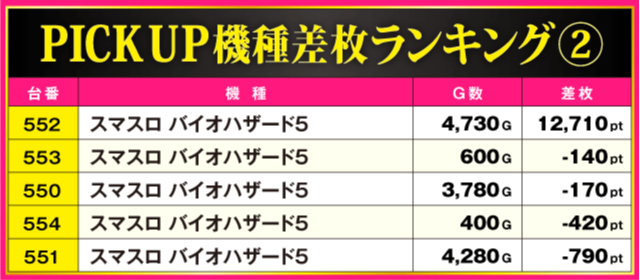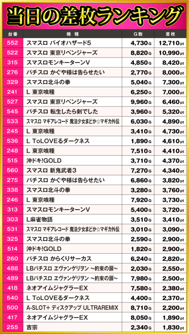 当日の差枚ランキング