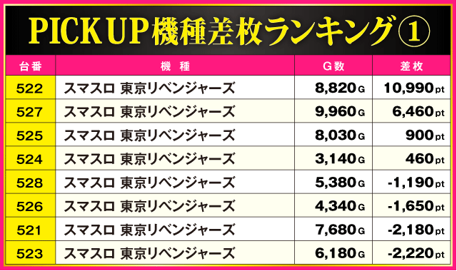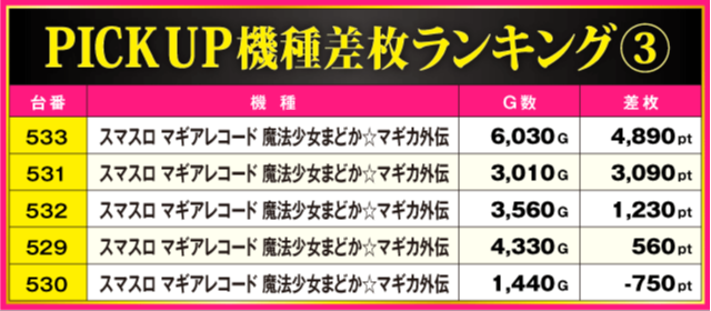 今回のPICK UP機種は全3機種。差枚上位にランクインした『スマスロ バイオハザード5』と『スマスロ 東京リベンジャーズ』以外に『スマスロ マギアレコード 魔法少女まどか☆マギカ外伝』からも多数の好調台を確認。533番台の+4,890ptをはじめ全5台中4台がプラス差枚となっているだけに、ファンにとって充実の一日となったのは間違いないだろう。