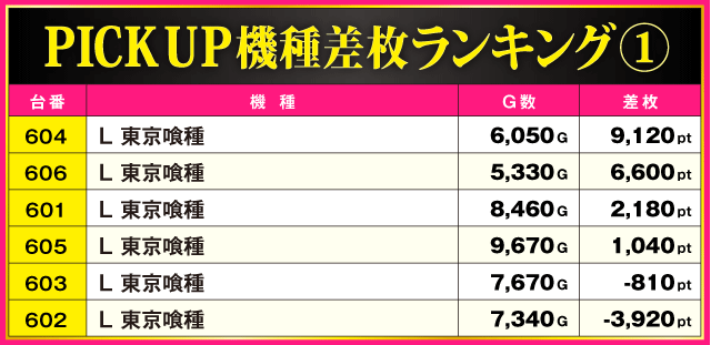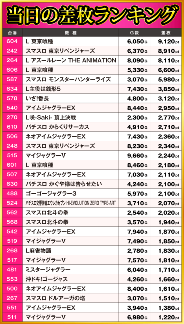 この日、最もプレイヤーの注目を集めたのが『L 東京喰種』で、ランキングトップに輝いた604番台の+9,120ptをはじめ、606番台が+6,600ptを記録するなどハイスコアを連発。さらに、ジャグラーシリーズも大奮闘しており、差枚TOP30に12台がランクインする見事な結果を残している。