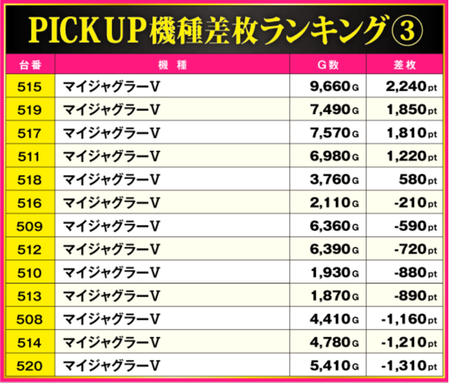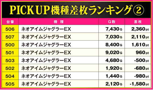 次にPICK UP機種の状況をチェックしていくと、ランキングを制した『L 東京喰種』は最終的に全6台中4台がプラス差枚に。また、『ネオアイムジャグラーEX』と『マイジャグラーⅤ』からも多数の好調台が確認されており、Aタイプならではの圧倒的安定感を遺憾なく発揮しファンを喜ばせいてた。