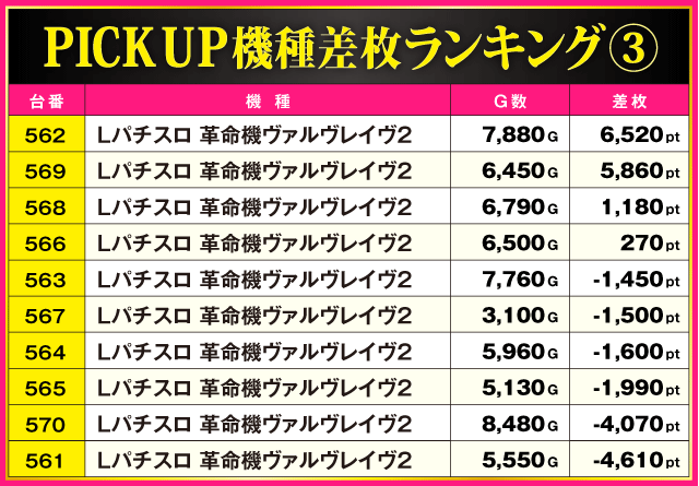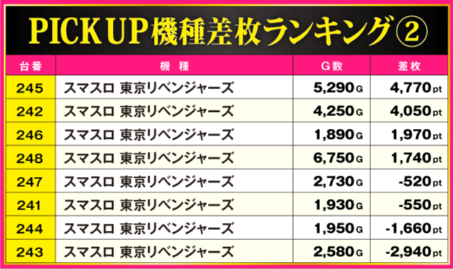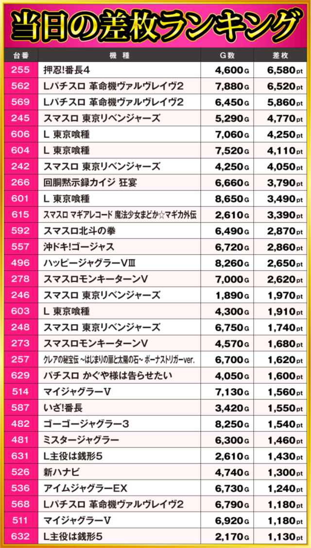当日の差枚ランキング