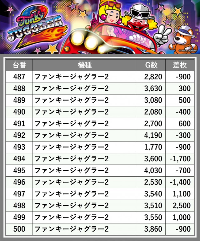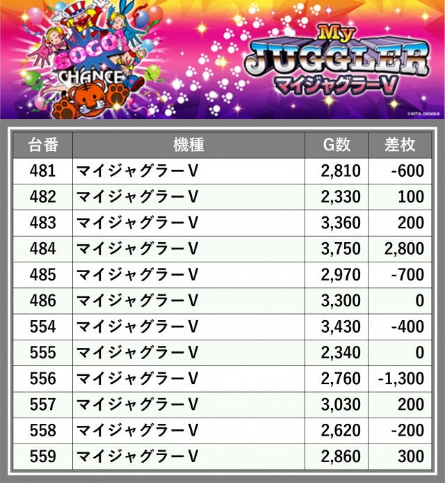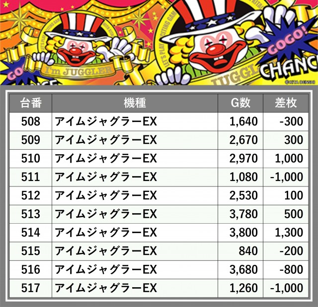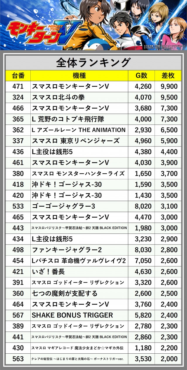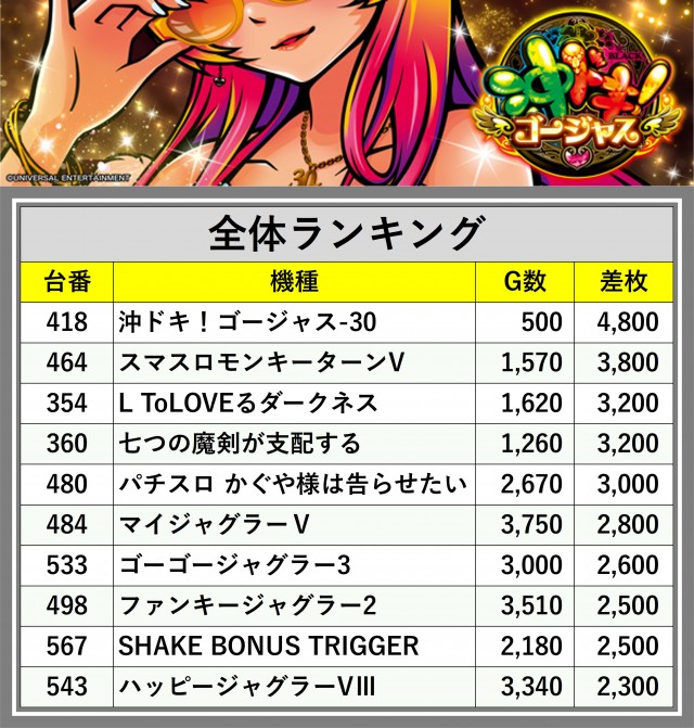 厳選された取材対象機種をはじめ、その他スロット全体から好記録が飛び出した!プレイヤーが楽しんだ1日を下記データにて振り返ってみて欲しい。