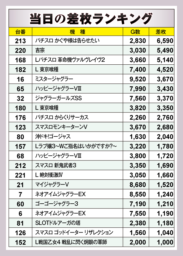 ※差枚数順に掲載しています。