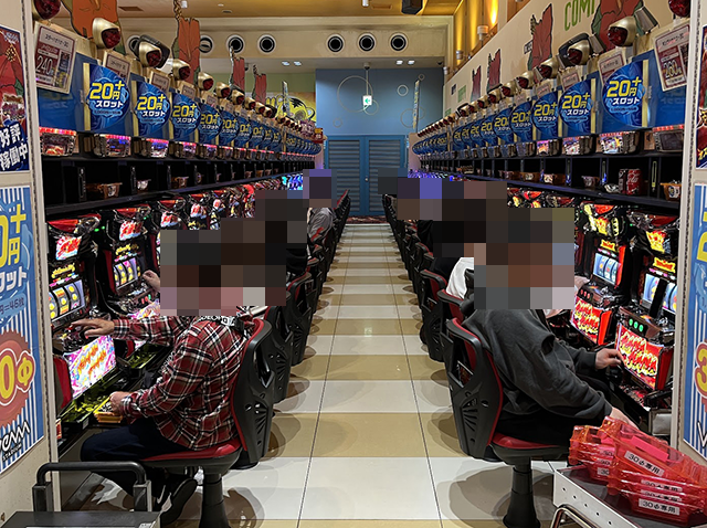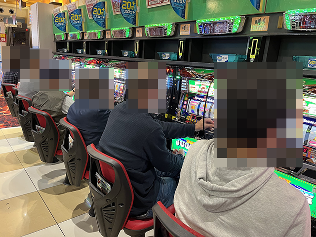 「アイムジャグラーEX」と「ネオアイムジャグラーEX」、「ハッピージャグラーVⅢ」の、どの機種にも華やかな光景が広がっていた。