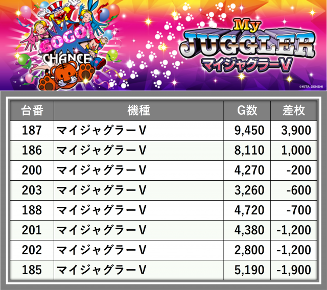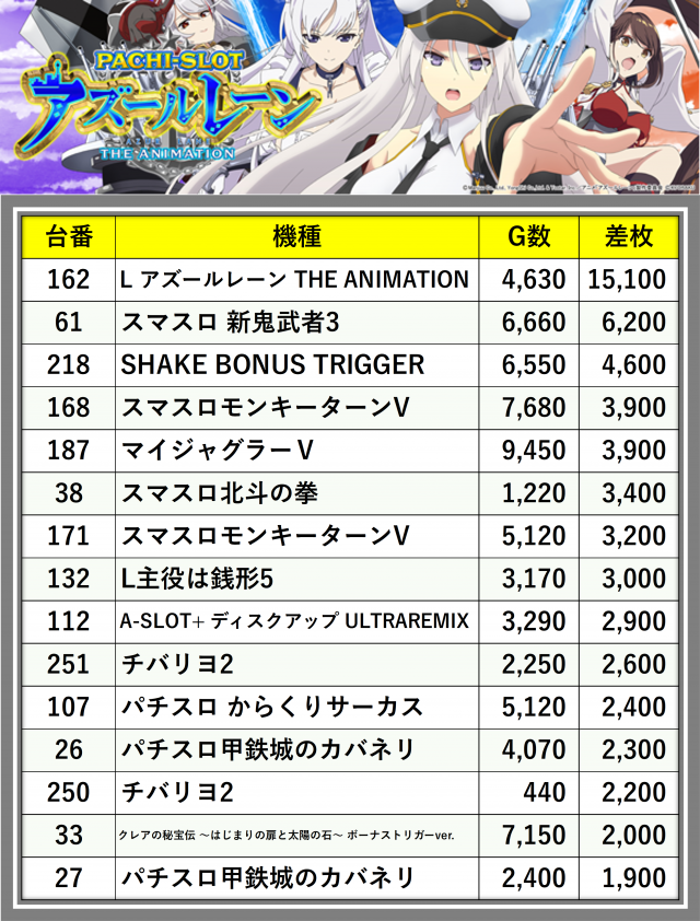 厳選された取材対象機種をはじめ、その他スロット全体から好記録が飛び出した!プレイヤーが楽しんだ1日を下記データにて振り返ってみて欲しい。