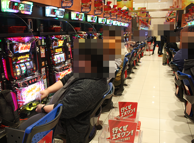 取材時の「e花の慶次~黄金の一撃」に空き台はなく、プレイヤーは明るい表情で遊技中。