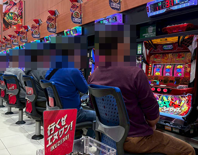 パチスロコーナーをまわっていると、「スマスロ 新鬼武者3」や「吉宗」で笑みを浮かべている姿を発見。