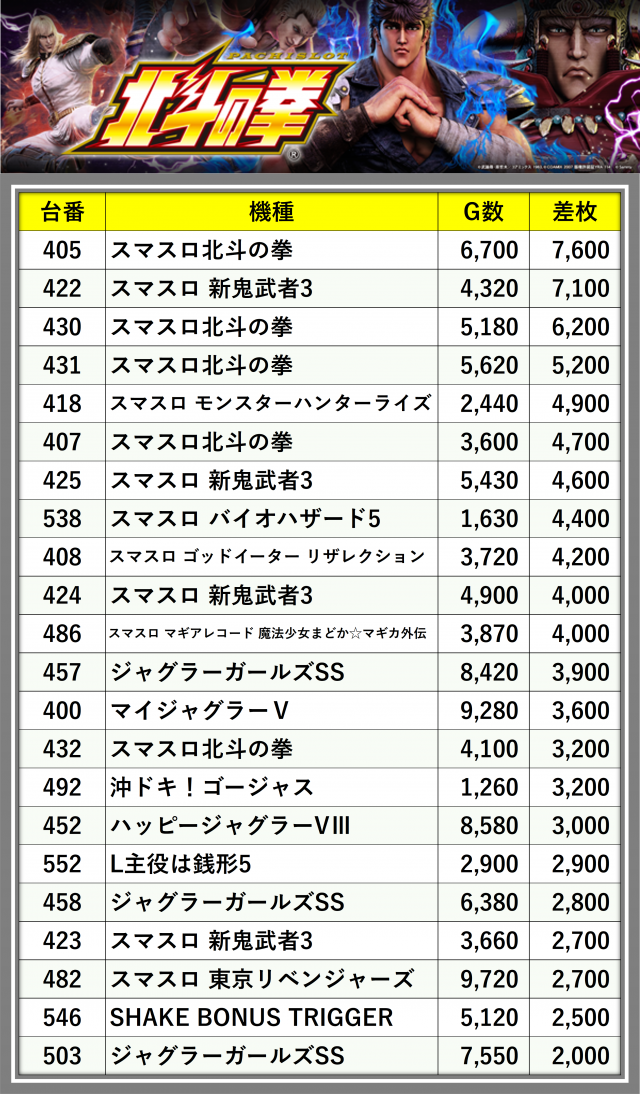 ※差枚数順に掲載しています