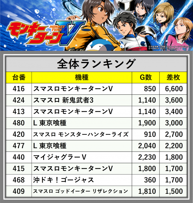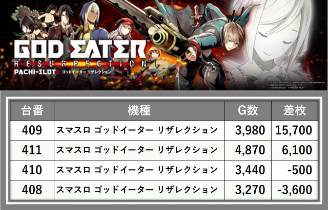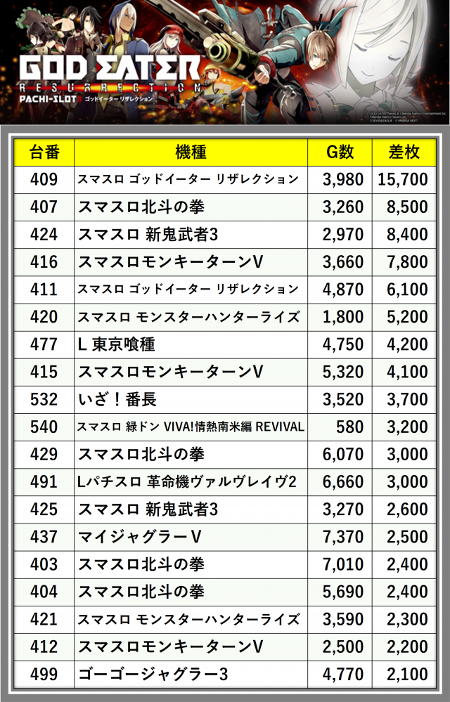 厳選された取材対象機種をはじめ、その他スロット全体から好記録が飛び出した!プレイヤーが楽しんだ1日を下記データにて振り返ってみて欲しい。
