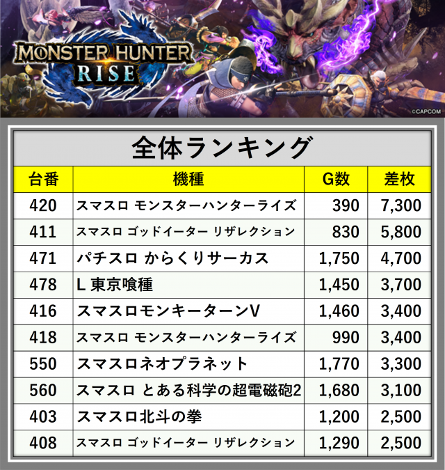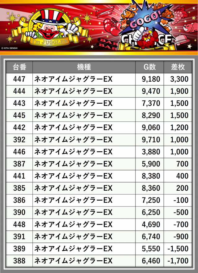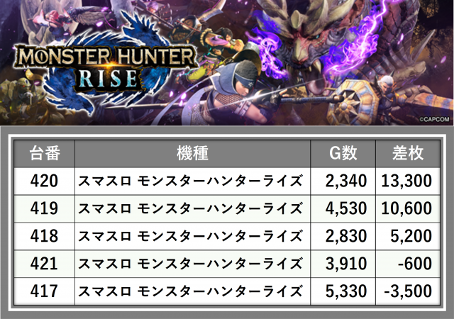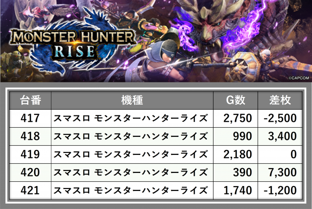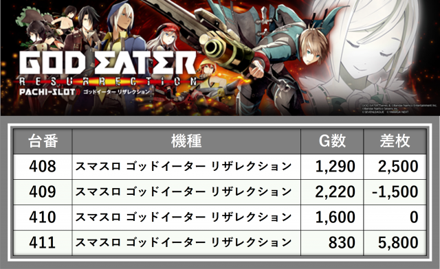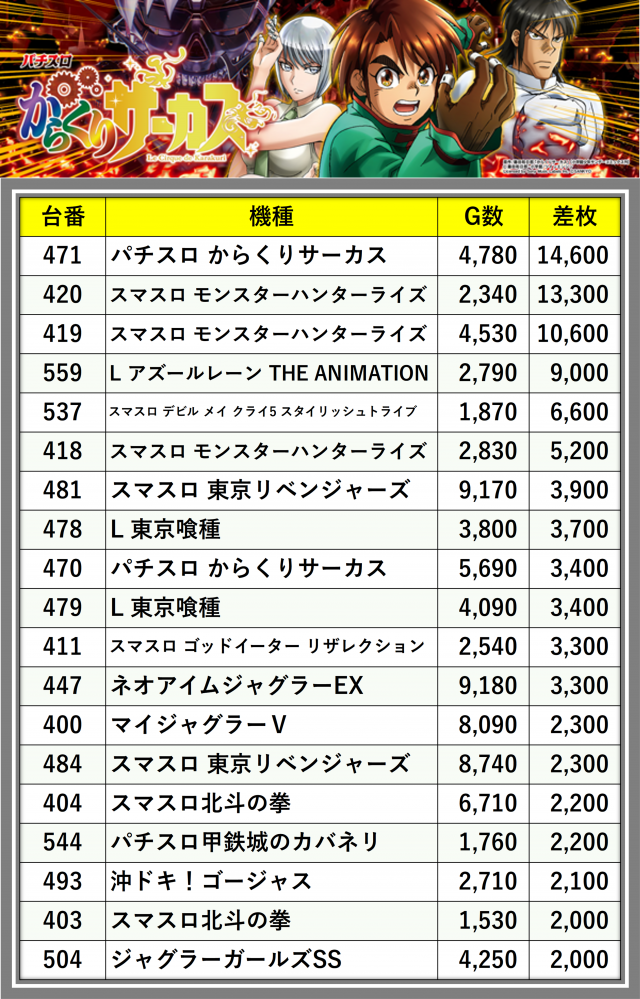 厳選された取材対象機種をはじめ、その他スロット全体から好記録が飛び出した!プレイヤーが楽しんだ1日を下記データにて振り返ってみて欲しい。
