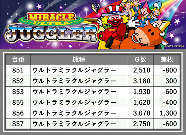 厳選された取材対象機種をはじめ、その他スロット全体から好記録が飛び出した!プレイヤーが楽しんだ1日を下記データにて振り返ってみて欲しい。