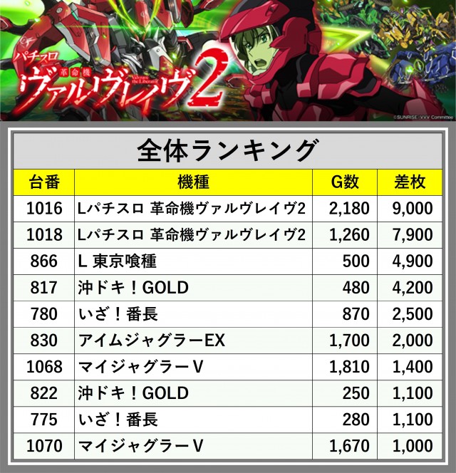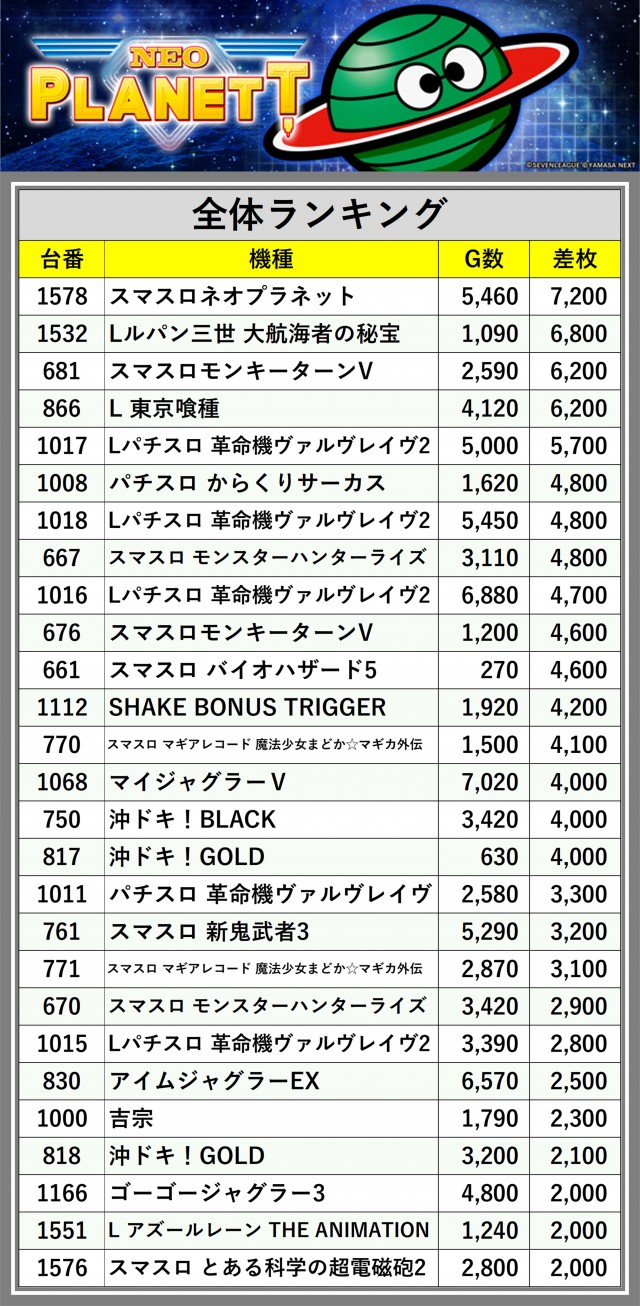 厳選された取材対象機種をはじめ、その他スロット全体から好記録が飛び出した!プレイヤーが楽しんだ1日を下記データにて振り返ってみて欲しい。
