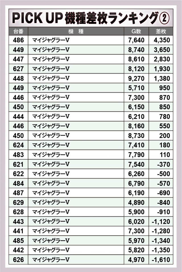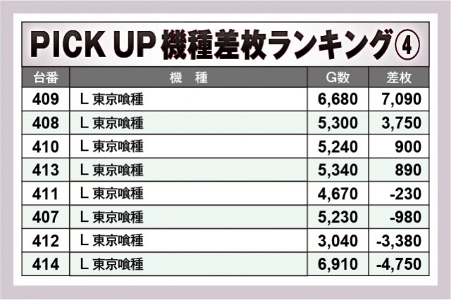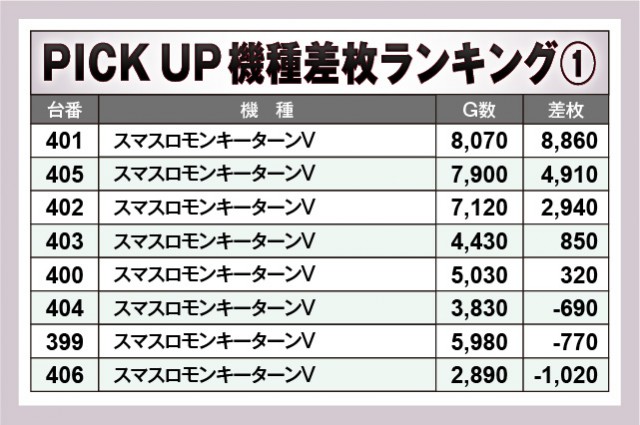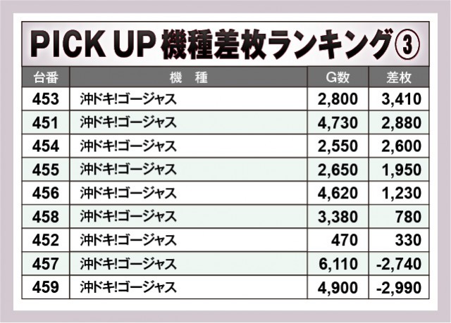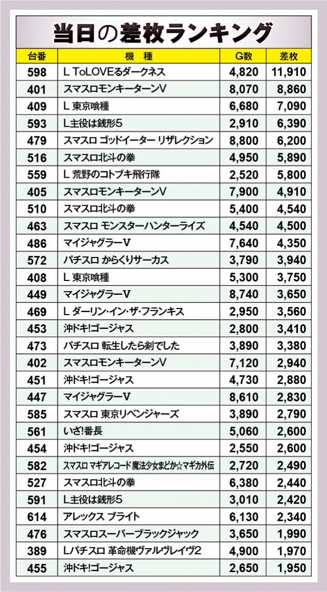 『L ToLOVEるダークネス』にて11,910枚という大きな熱気が放たれ、さらには『スマスロモンキーターンV』『L 東京喰種』などの人気機種も大台突破を果たしている。また全体的に高い回転数をマークしており、大きな盛り上がりに包まれていたのは間違いない。そこに沖スロ『沖ドキ!ゴージャス』やノーマル機の名前も確認できるため、スペック問わず幅広い機種が活躍していたとも言える。