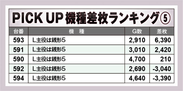 『スマスロモンキーターンV』『L 東京喰種』『L主役は銭形5』は大台突破を果たしており、店内の盛り上がりをリードする存在となっていた。もちろん『沖ドキ!ゴージャス』もコンスタントに大当りを積み重ねており、半数がプラス差枚数を達成。『マイジャグラーⅤ』では回転数と差枚数が比例する展開を披露しており、店内各所にてハイパフォーマンスが披露されていた様子が窺えるばかりだ。