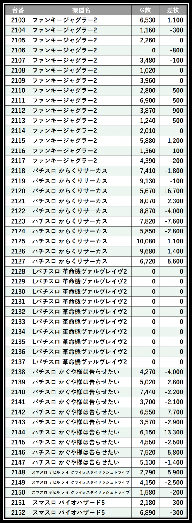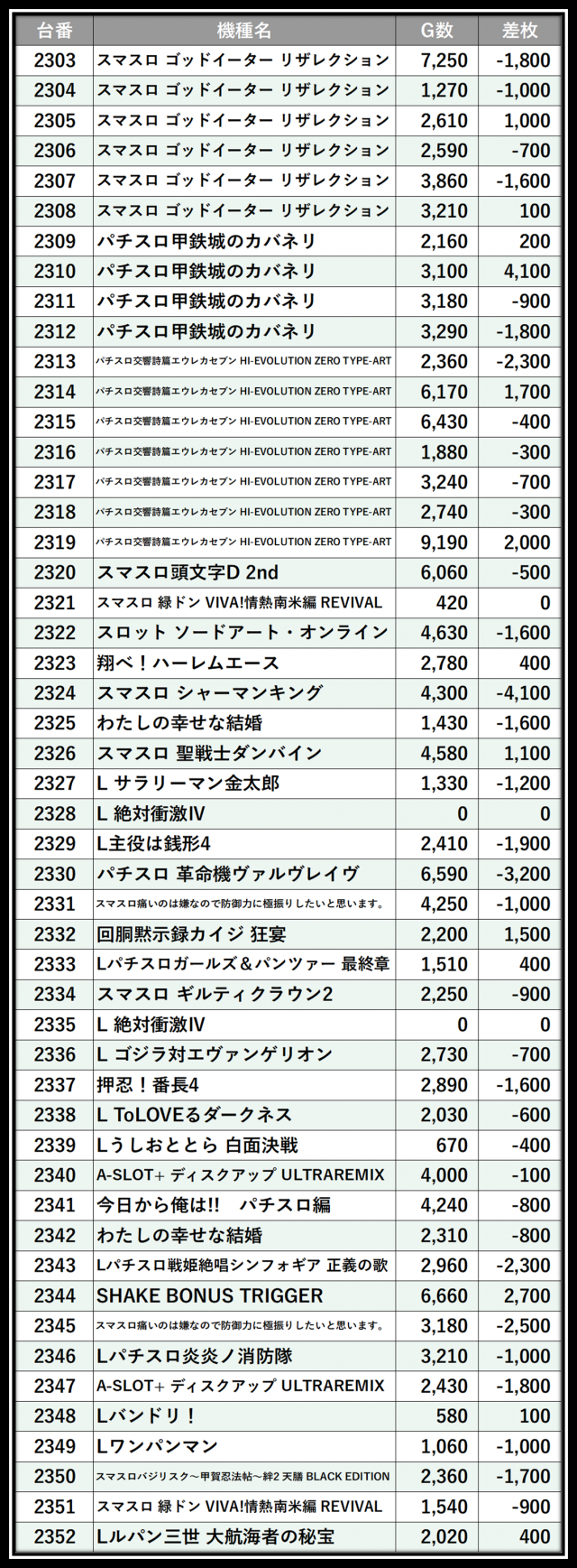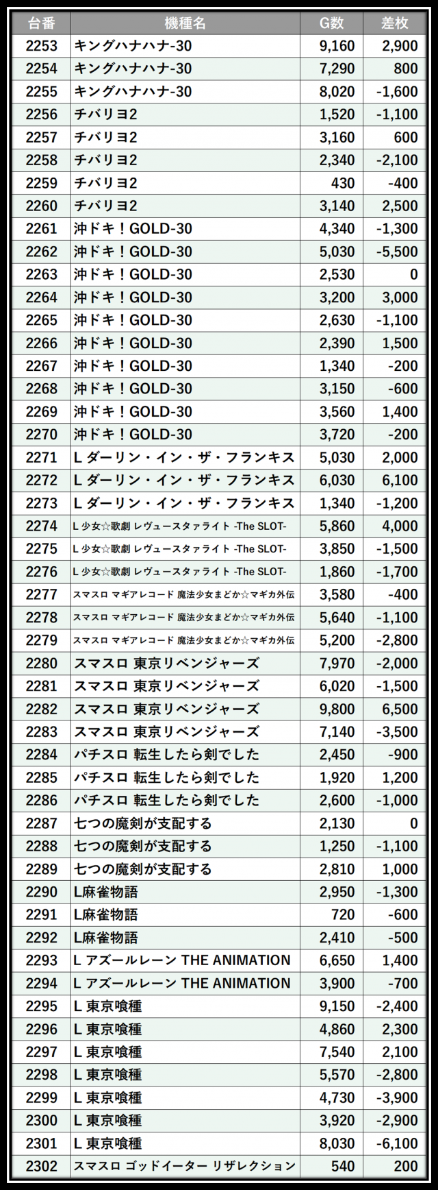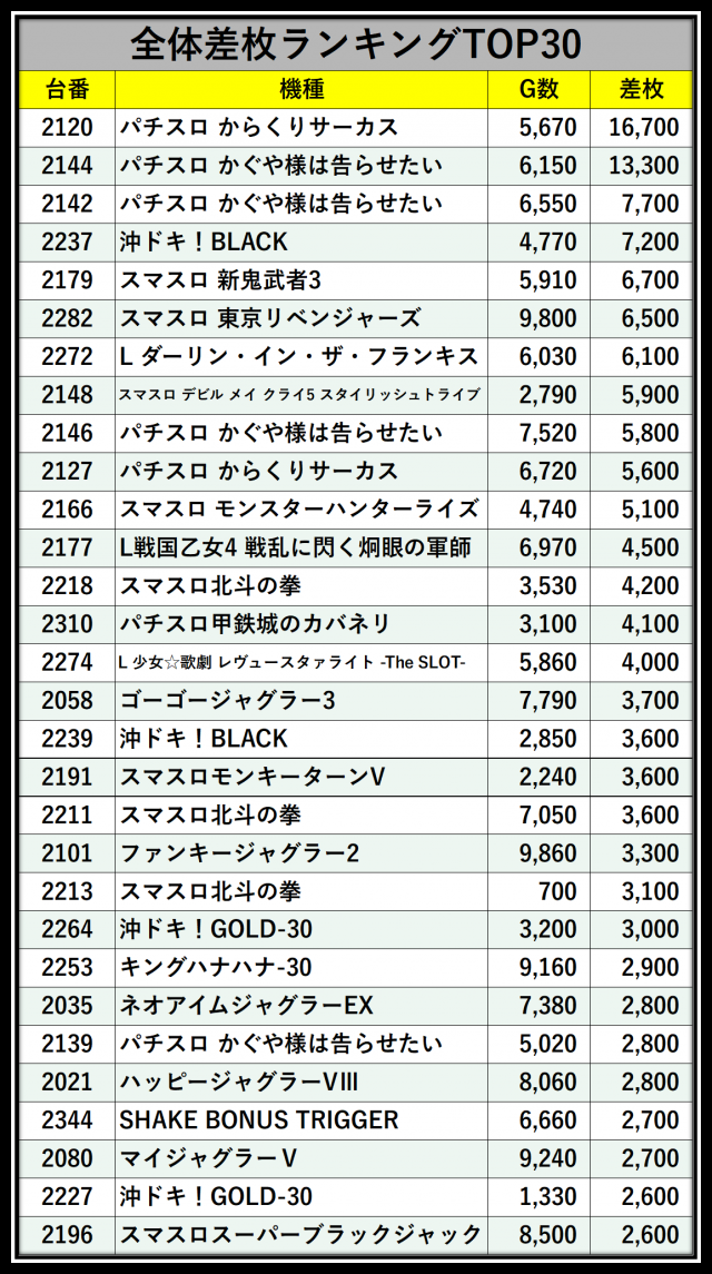※差枚数順に掲載しています