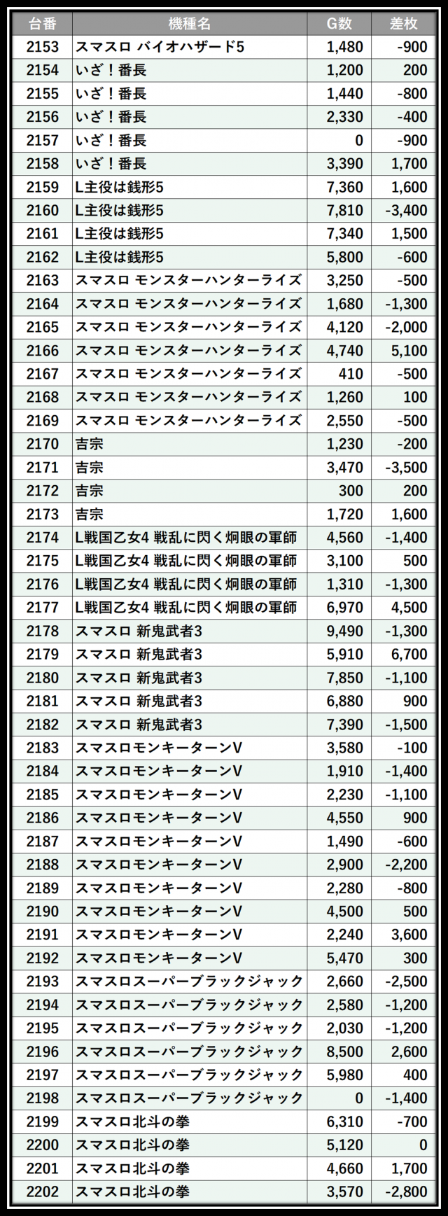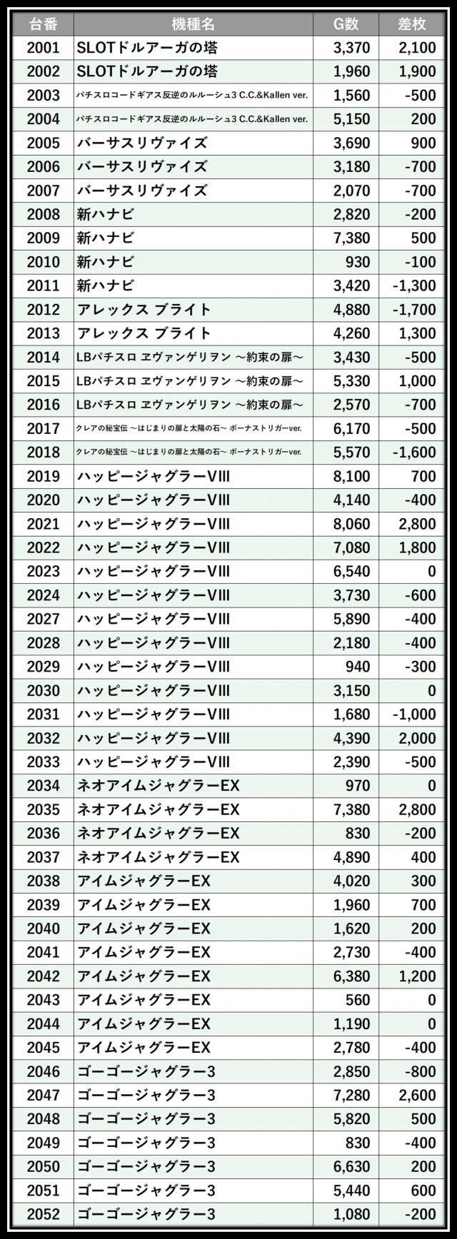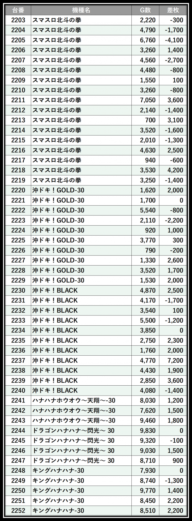 ※差枚数順に掲載しています