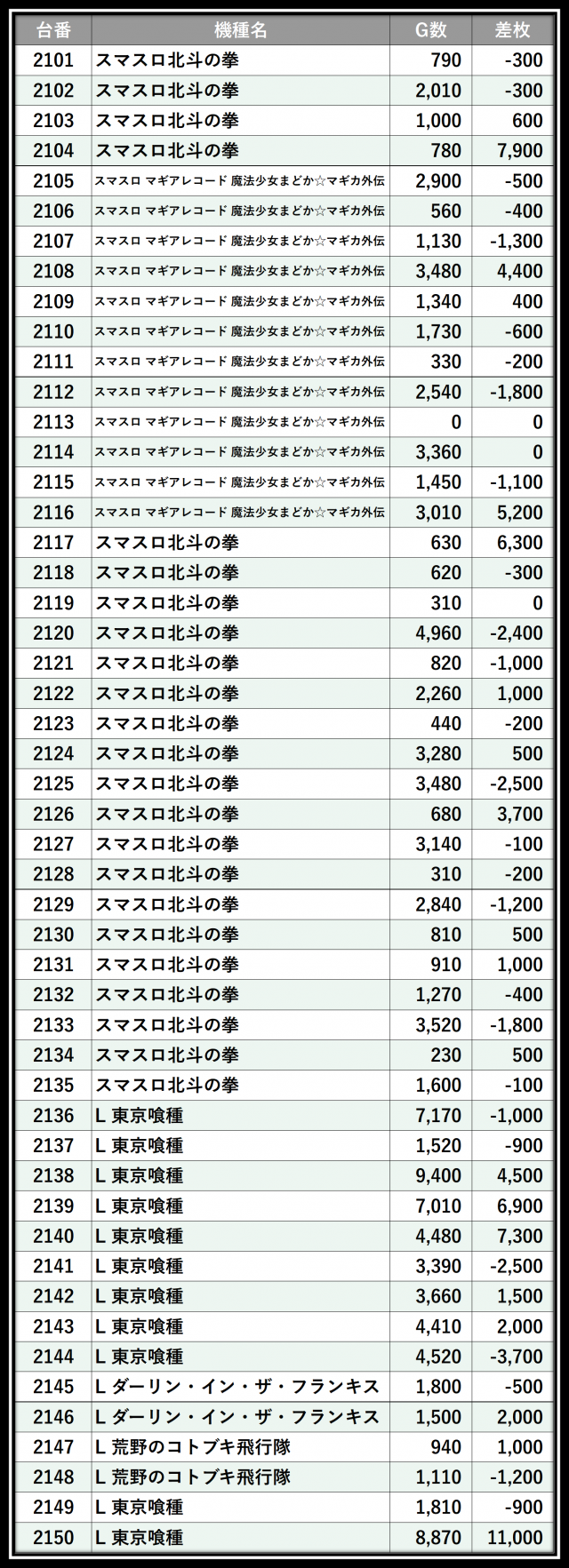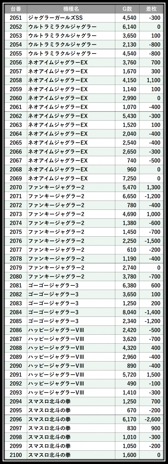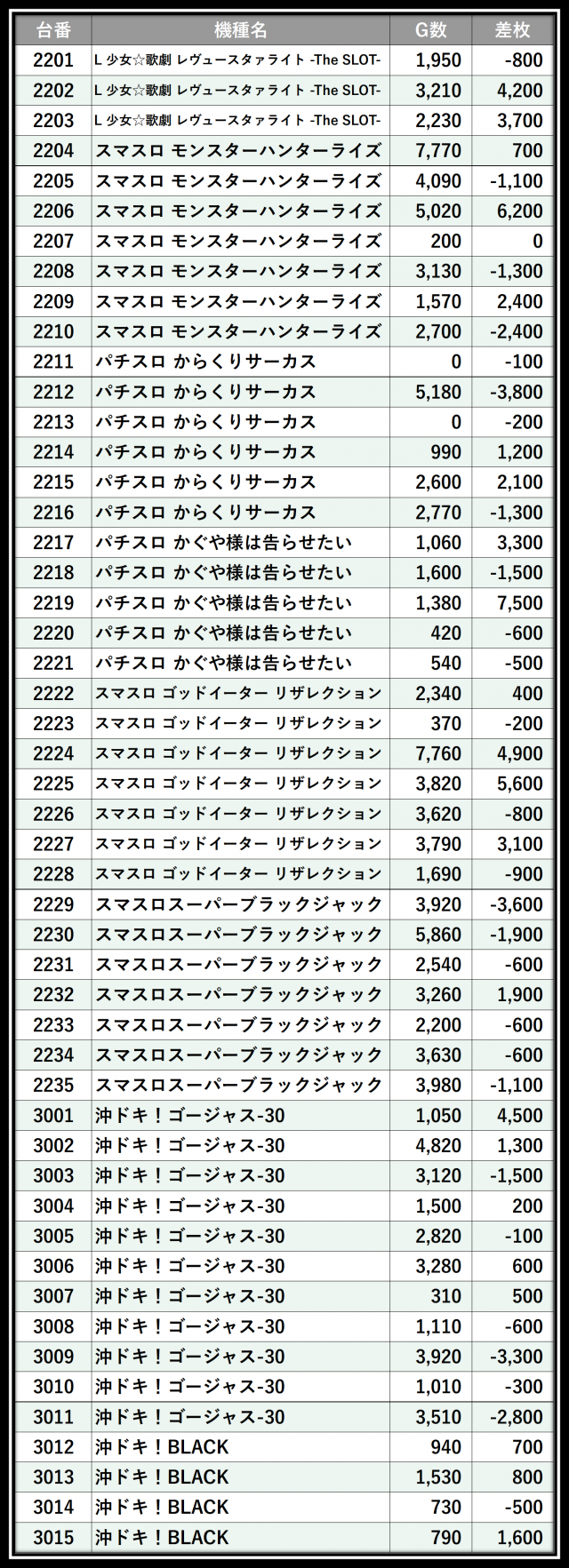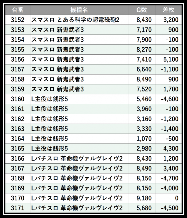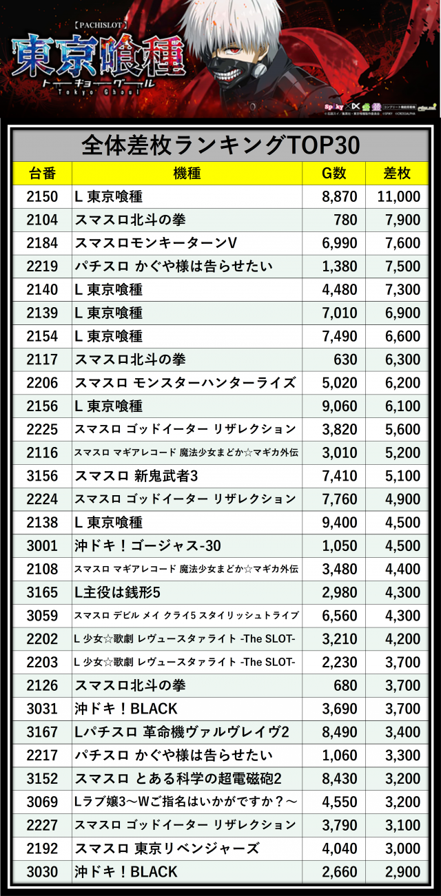 ※差枚数順に掲載しています