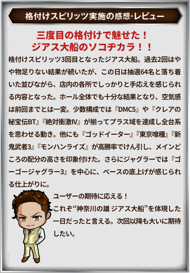 11月5日(水)ジアス大船にて、DMMぱちタウンの「格付けスピリッツ」を実施。