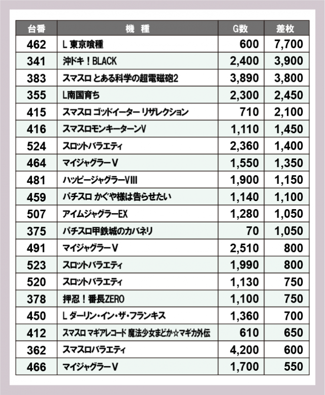 ※差枚数順に掲載しています