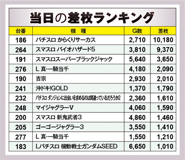 上表の7機種はいずれもポテンシャルを秘めた台で、やはり『パチスロ からくりサーカス』『スマスロ バイオハザード5』が大きな存在感を放っていた。その他の機種も負けておらず、『L 真・一騎当千』は全台プラス差枚数を達成。また『スマスロスーパーブラックジャック』『スマスロ 新鬼武者3』もじっくりと打ち込まれた形跡が見られ、ファンが好感触を手にしていたのは間違いないだろう。