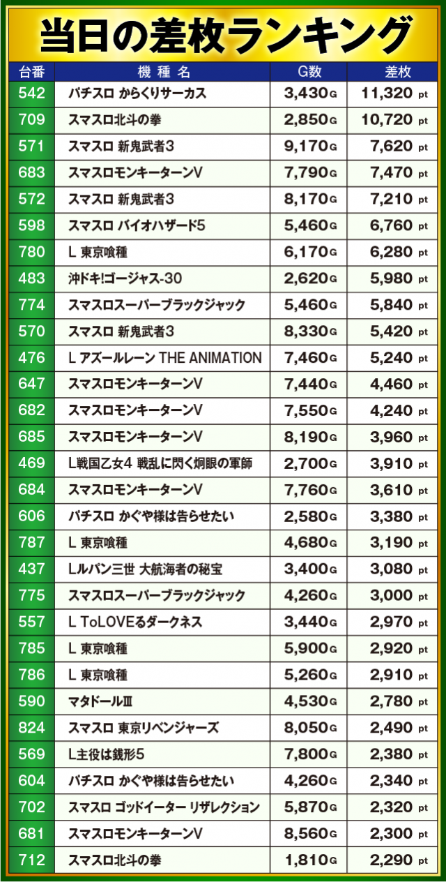 レポートの最後に「Super D’STATIONガーデン前橋店」の差枚ランキングも掲載!
