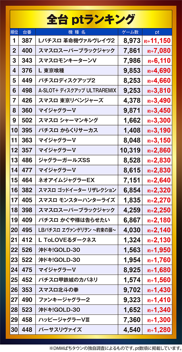 最新機種である「Lパチスロ 革命機ヴァルヴレイヴ2」の387番台が約+11,000ptオーバー!