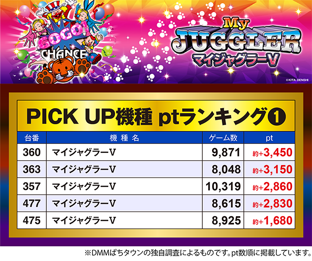 「マイジャグラーⅤ」の360番台と363番台が約+3,100pt以上。