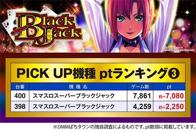 2台が約+2,200ptを上回った「スマスロスーパーブラックジャック」では、400番台が約+7,080ptを記録した。