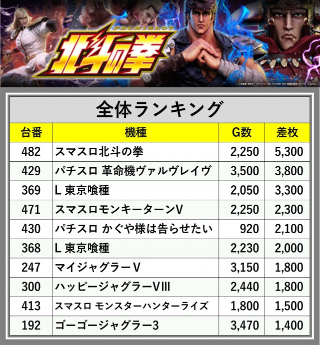 厳選された取材対象機種をはじめ、その他スロット全体から好記録が飛び出した!プレイヤーが楽しんだ1日を下記データにて振り返ってみて欲しい。