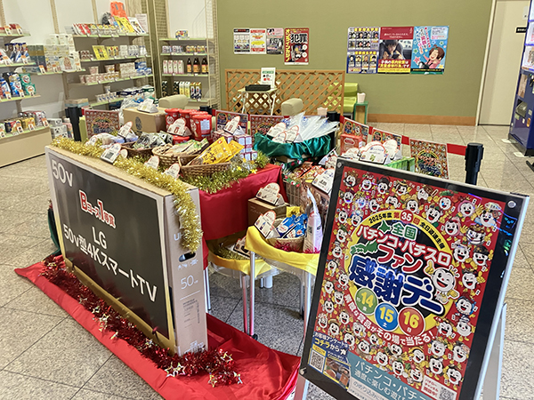 景品コーナーには日用品やインスタント食品のほか、ファン感謝デーの景品も用意されており、プレイヤーたちの目を引いていた。