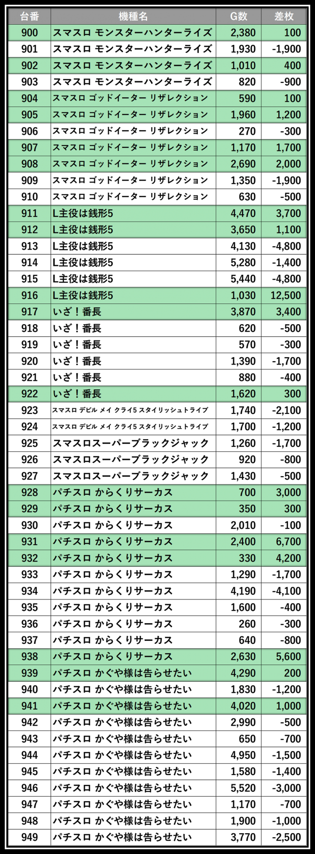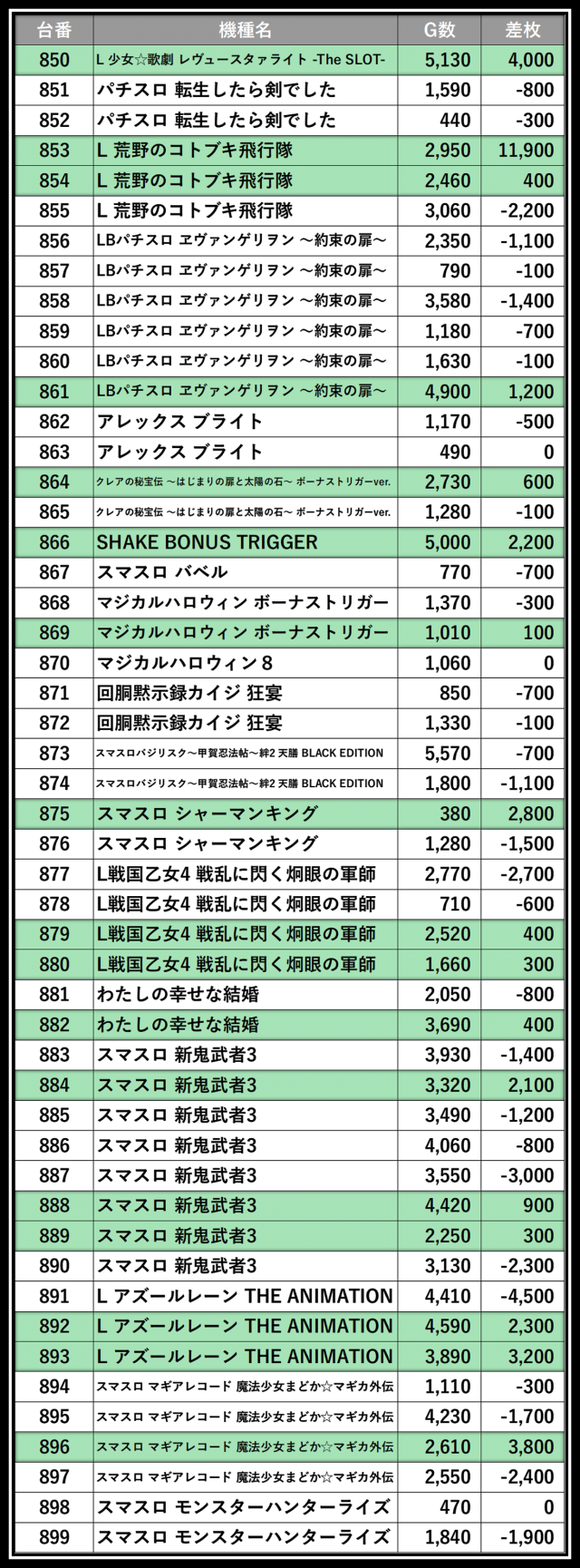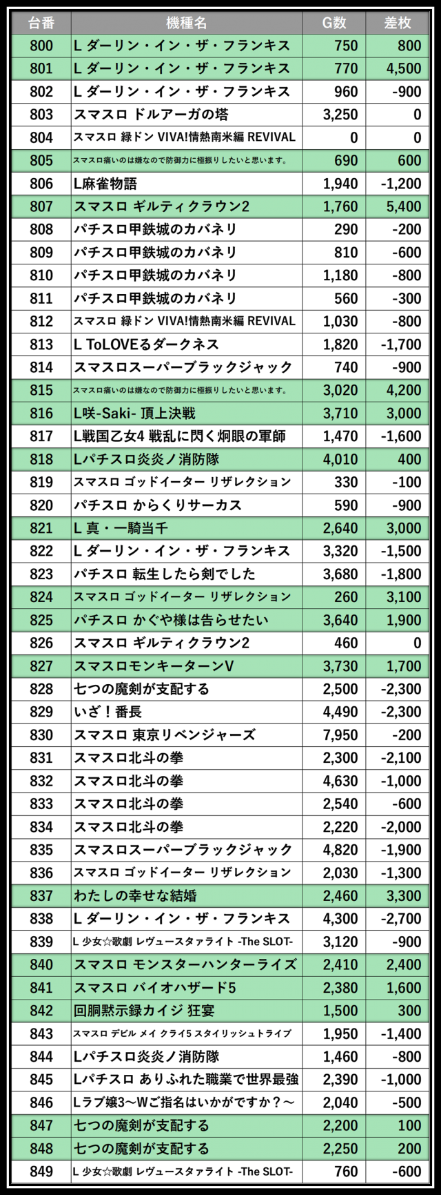 ※差枚数順に掲載しています