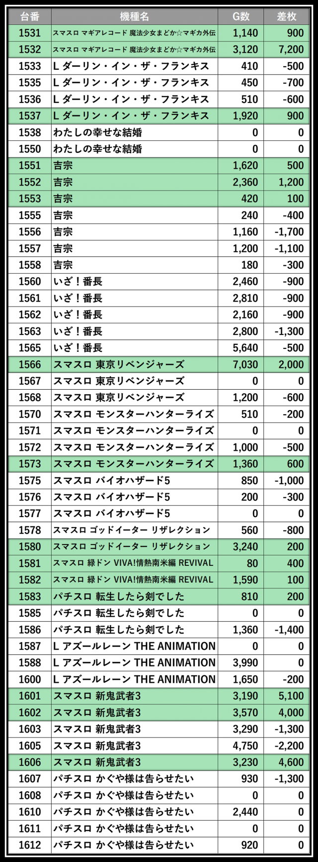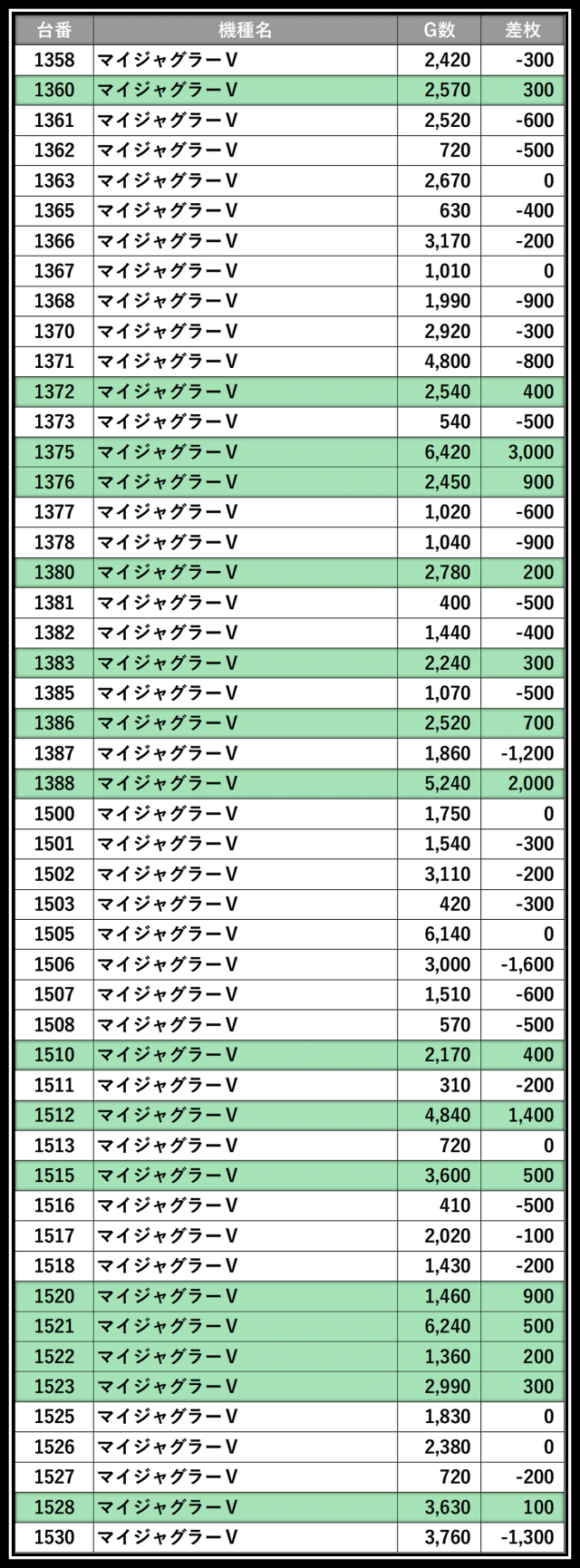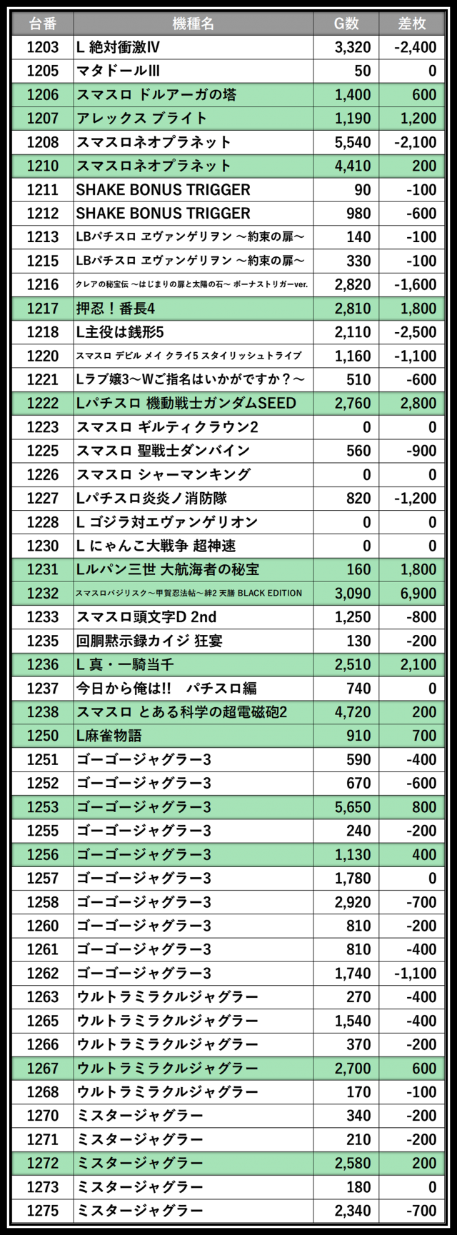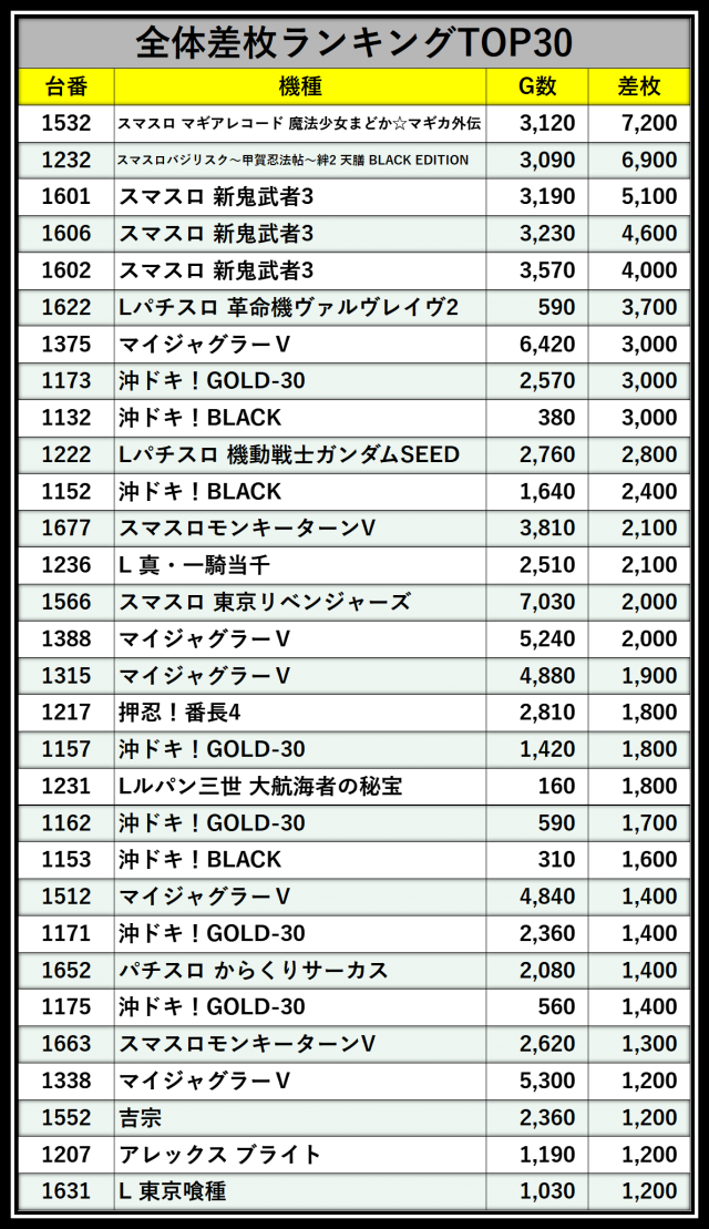 ※差枚数順に掲載しています