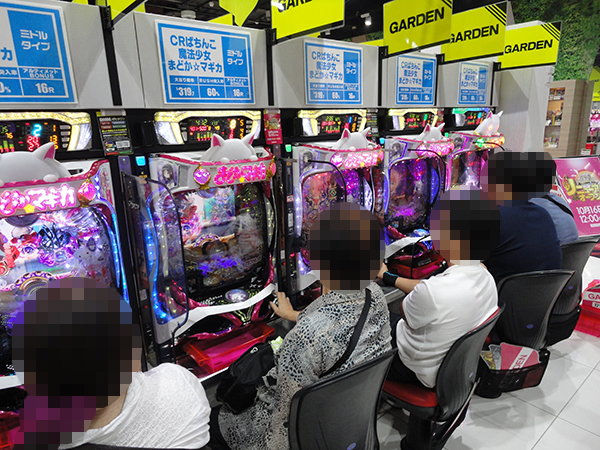 この日もたくさんのプレイヤーが集合。パチンコ・パチスロ共に、どこを見ても明るい笑顔が広がっていた。
